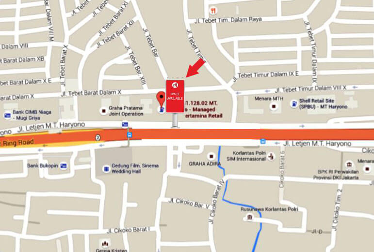 Billboard 8 m x 16 m, 1 muka, ver – Jl. MT. Haryono (SPBU Pertamina – dekat Bus Shelter Trans Jakarta – Tebet BKPM) Jakarta Timur